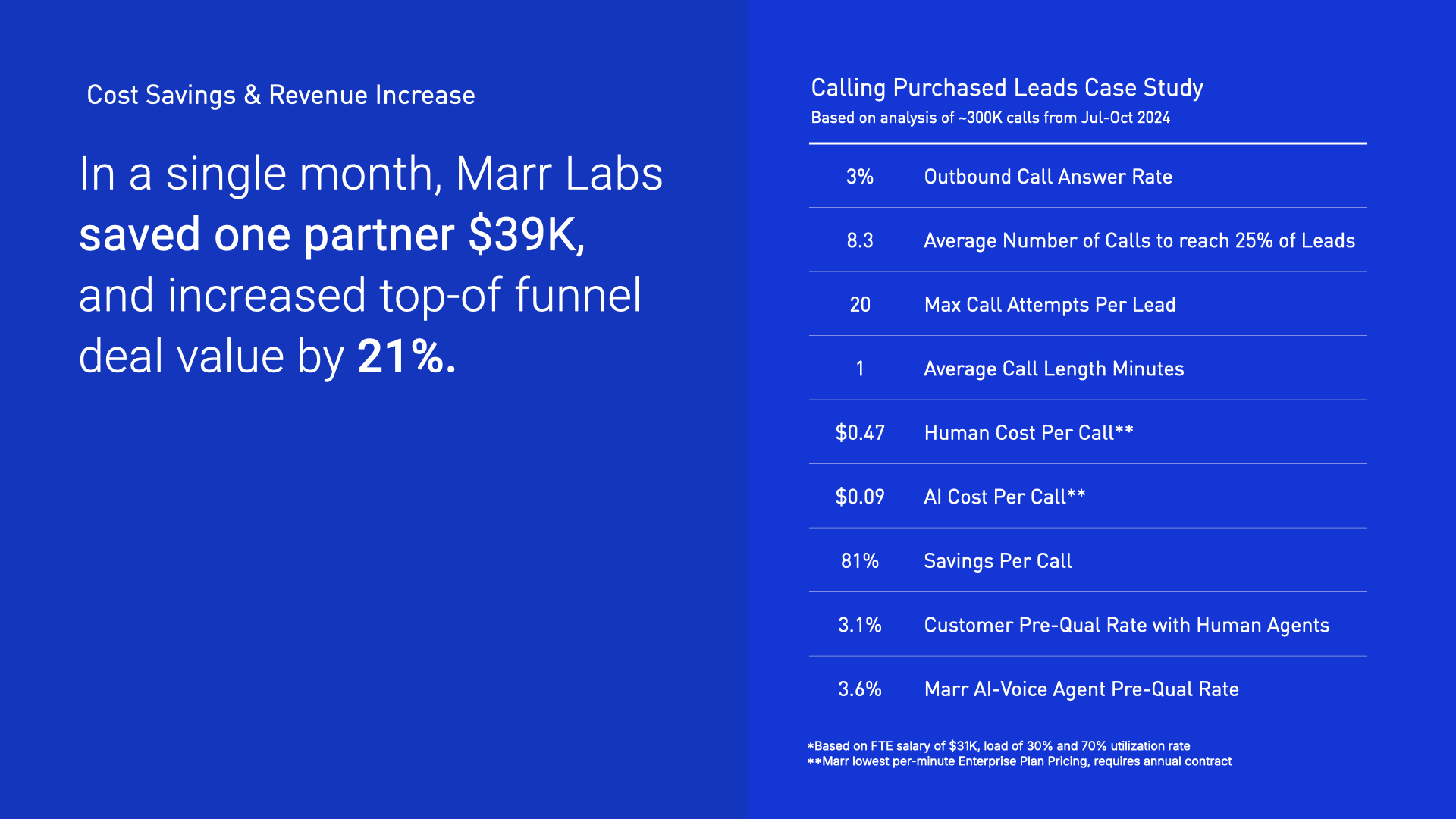 Faster speed-to-lead: AI voice agents like Marr Labs dial in less than a second, qualifying borrowers while they’re still on your landing page or after-hours.